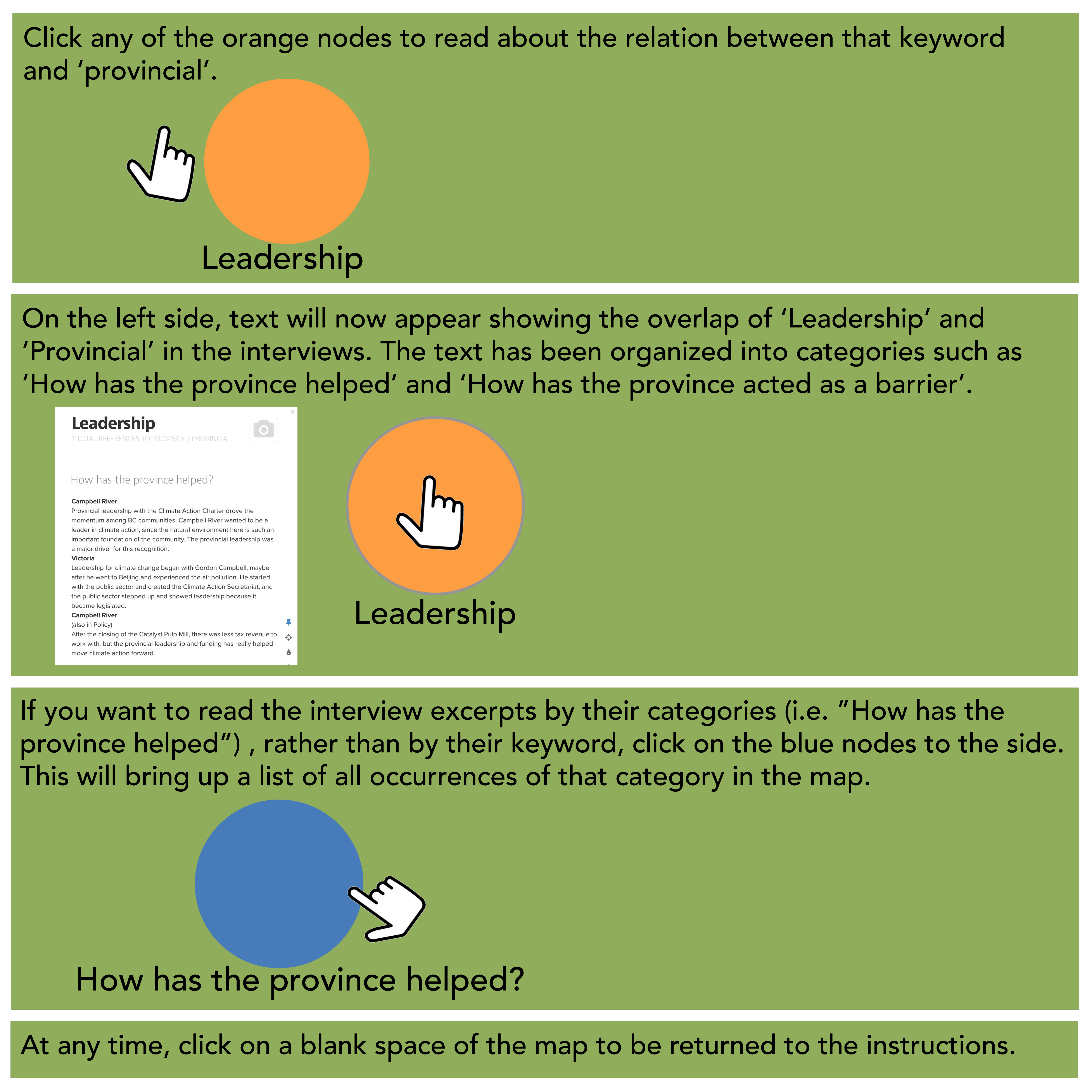 To start, click any of the orange nodes to read about the relation between that keyword and 'provincial'. Or, click on a blue node to read the interview excerpts by category (i.e. "How has the province helped') rather than by keyword.
