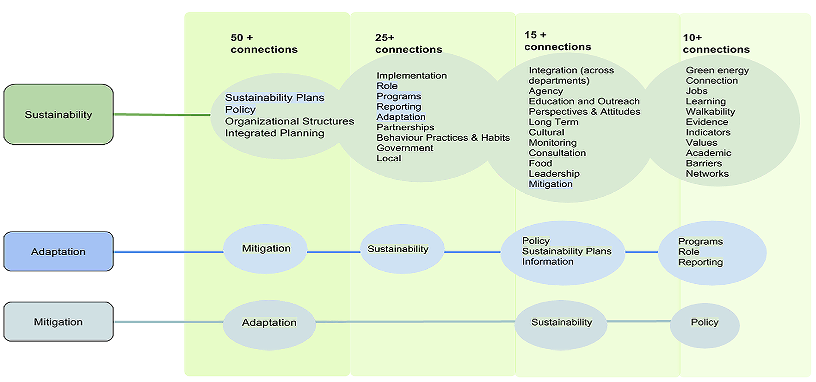 Using the interview data from both phases of the MC3 research project, this visualization shows the topics that are most closely connected to three 'umbrella' terms: sustainability, adaptation, and mitigation. A connection between two topics is here determined by sharing a context of ten words. The more connections there are throughout the entire corpus of interviews, the more closely these topics are connected. For example, 'sustainability' and 'policy' were spoken about in the same context 81 times throughout the interviews. This visualization includes only connections that occurred more than ten times throughout the corpus. Highlighted topics mean that they show up under multiple umbrella topics.